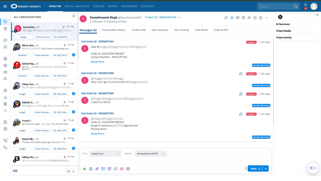 Once they moved to Konnect Insights, everything came together in one unified workspace. The team started using the AI-powered ticket inbox to manage spikes during peak meal hours, relying on AI Assist for quick, consistent replies and AI Summaries to speed up internal collaboration. Customer360 gave store managers instant visibility into each customer’s past interactions, helping them resolve issues without back-and-forth.